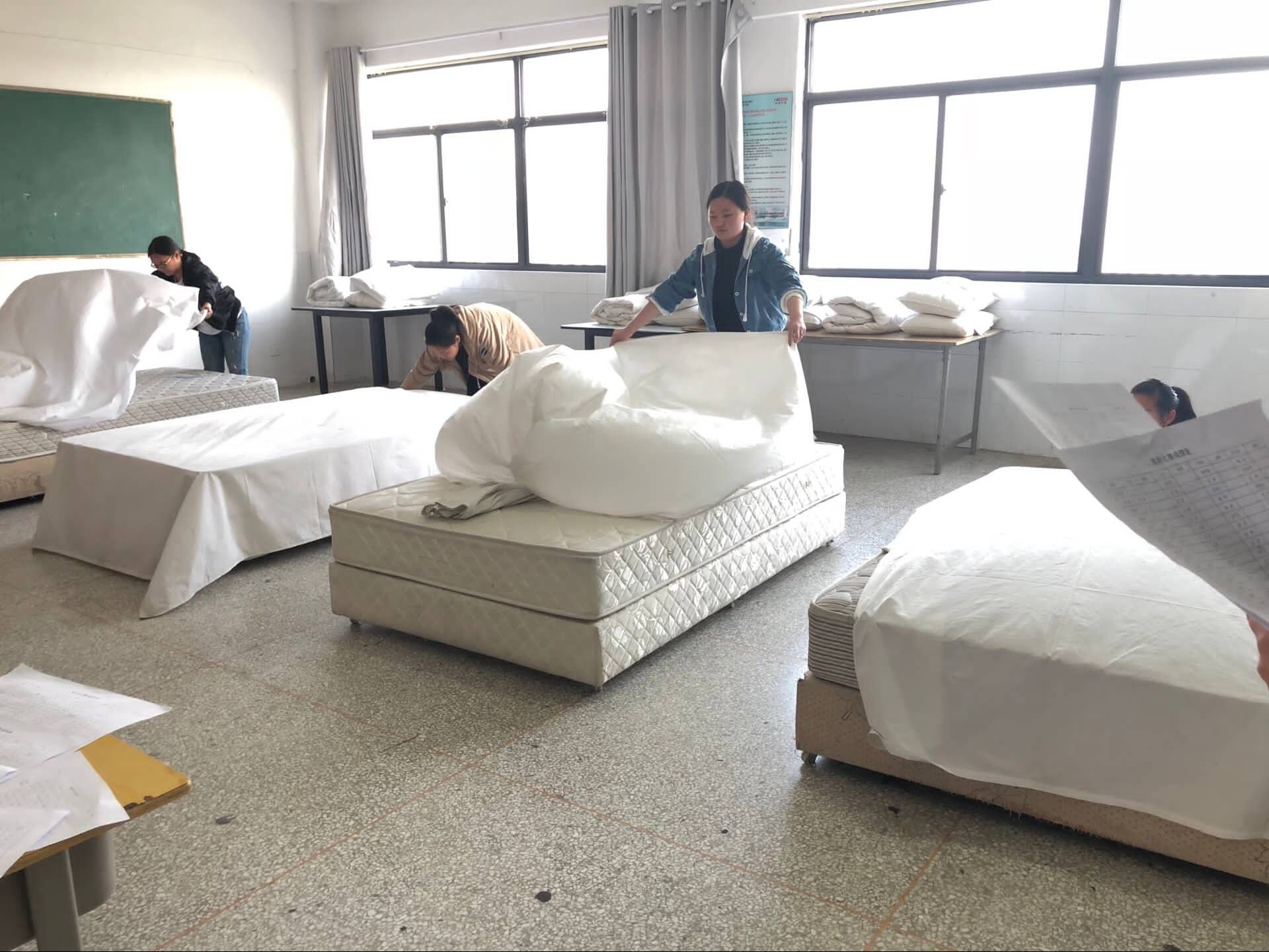 比赛现场紧张激烈,参赛选手动作熟练、平稳、迅速。套枕头、铺床单、套被罩、摆装饰,整个过程行云流水。来自高乘1602班的郑华飏同学说:“通过参加这样的技能比赛,我的客房服务技能得到了提高,平时所学的专业知识在这次比赛中派上了用场,取得好的成绩得到了老师们的肯定,也更增添了我今后学习的信心。”
