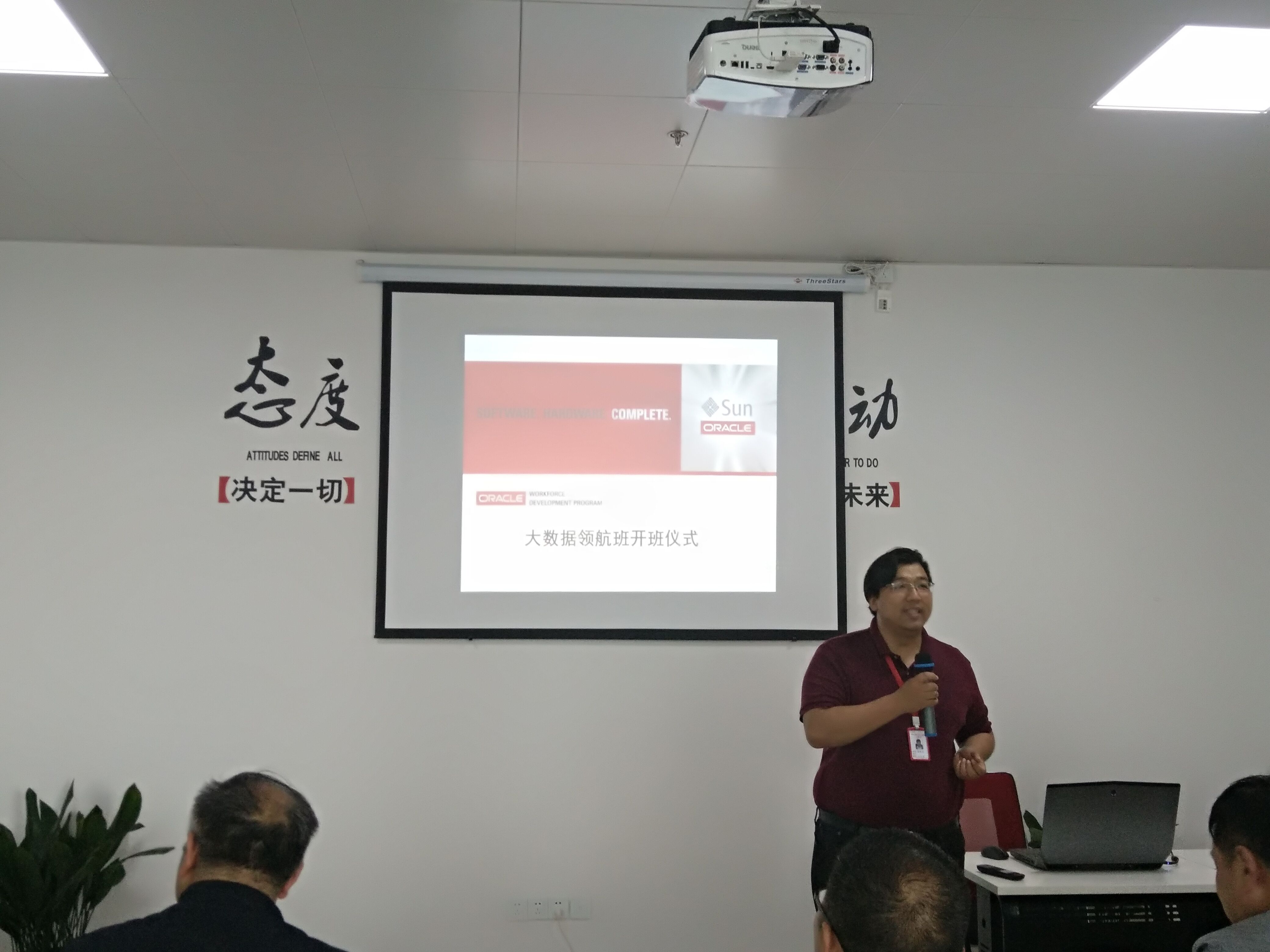 仪式由甲骨文(盐城)公司负责人主持。我校校领导戴永湖为开班仪式致辞,并强调人才是国家快速发展的最大资源,尤其在领航班所学的大数据应用技术是现代紧缺的技术,希望领航班的学员们珍惜自己的青春时光和学习机会,努力扎实学习专业本领,为今后的发展打下坚实的基础。
