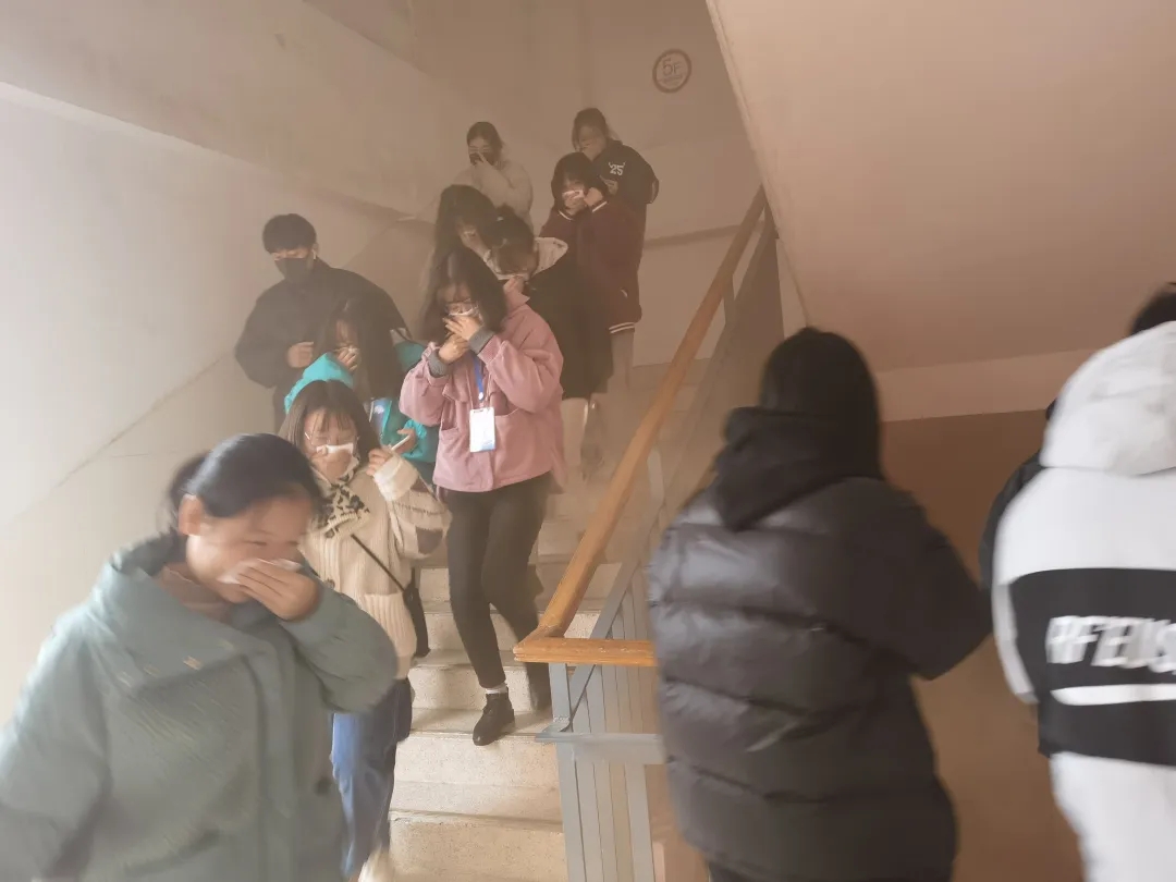 此次消防演练的主要内容是通过模拟火灾现场,指导师生在发生火灾后如何自救逃生。演练期间,师生用湿毛巾捂住口鼻,在引导员的指令下有序撤离“火灾现场”。通过学院前期精密部署,整场演练活动规范有序、紧凑高效。