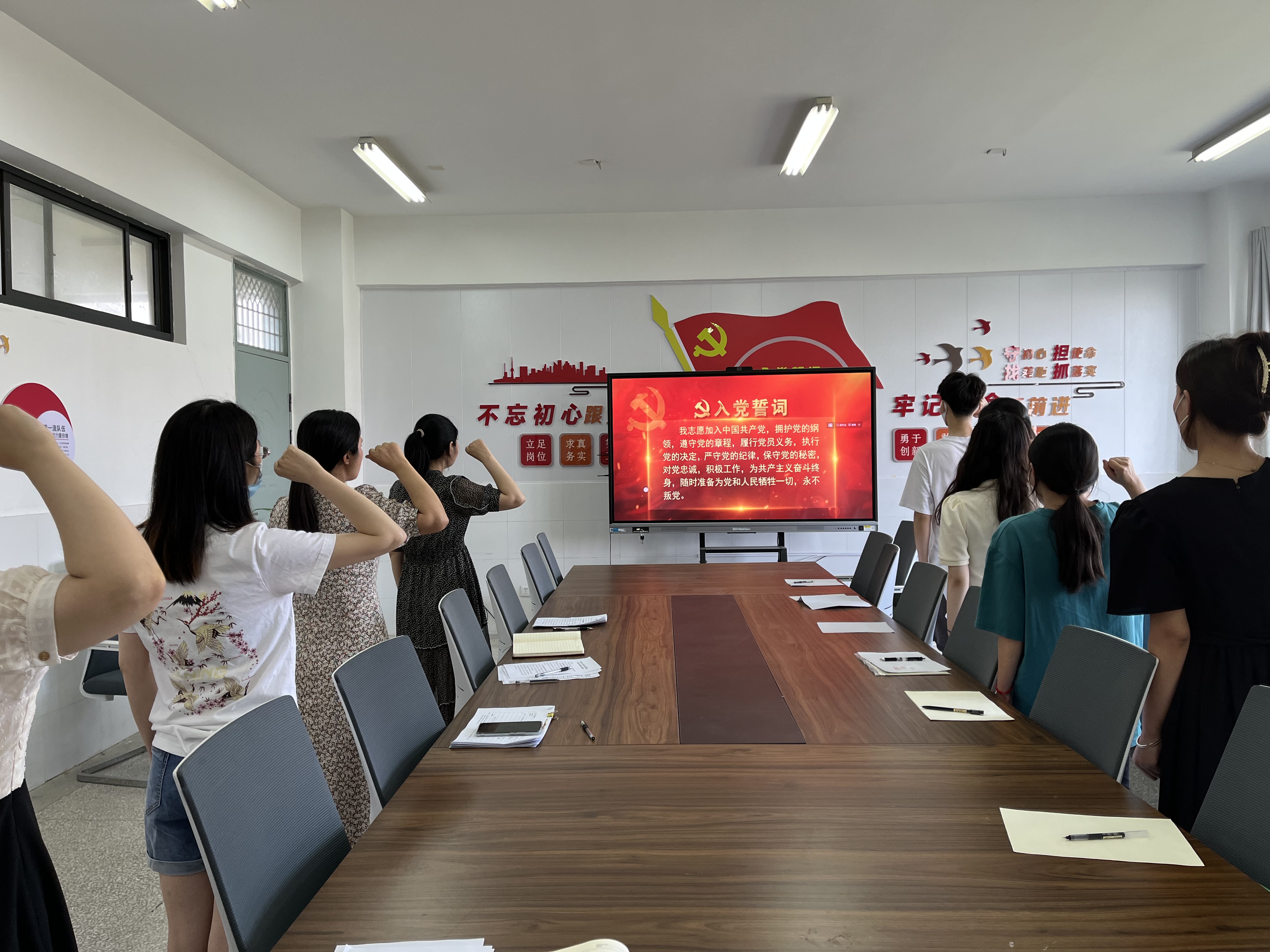 随后全体参会老师及毕业生党员重温入党誓词,党员同志们举起右手,有力的表达着作为共产党员的使命感与自豪感。宣誓后,毕业生党员表示在离开母校后会时刻提醒自己不忘入党初心,在前进道路上砥砺前行。