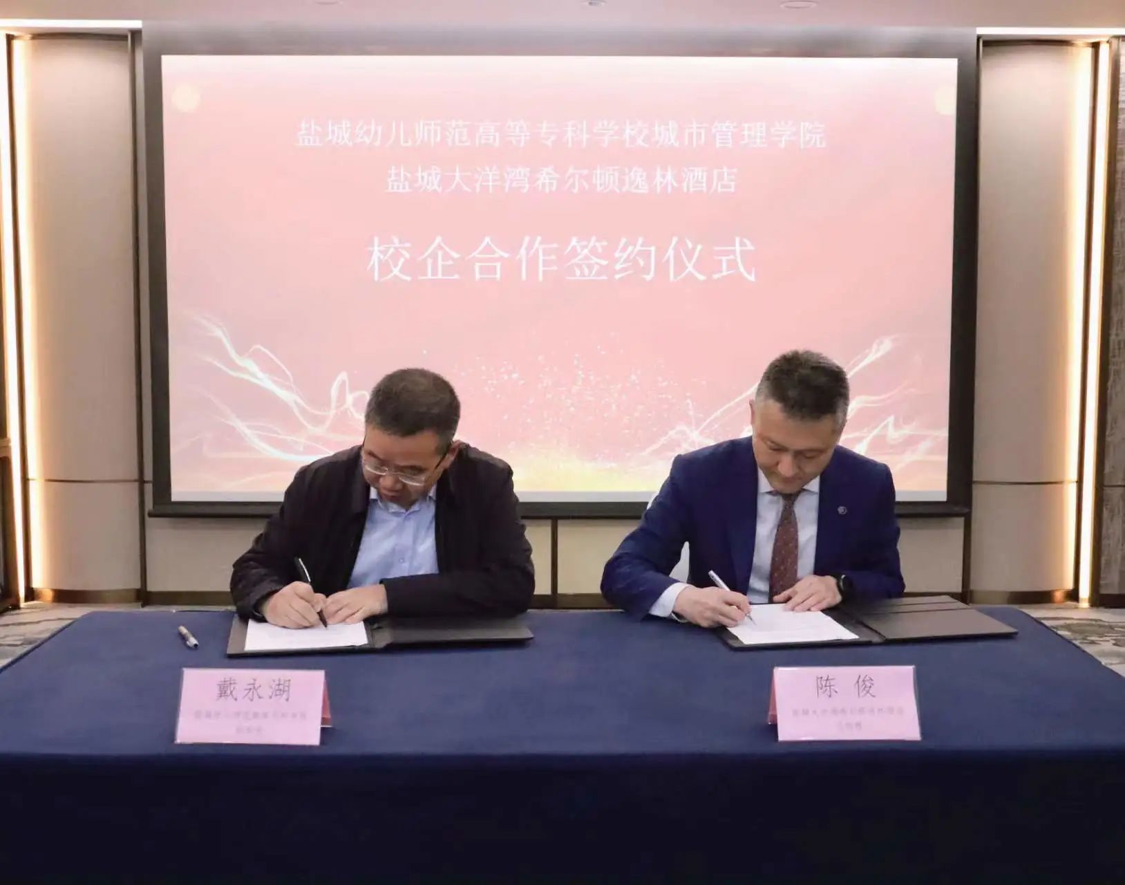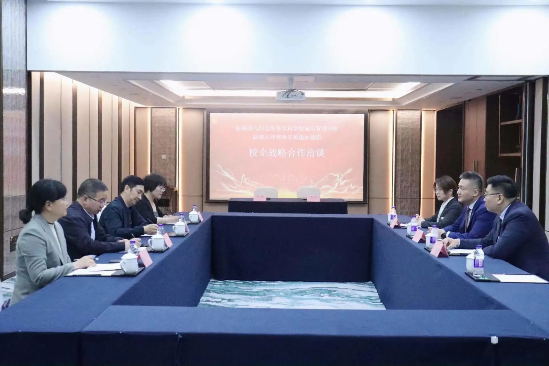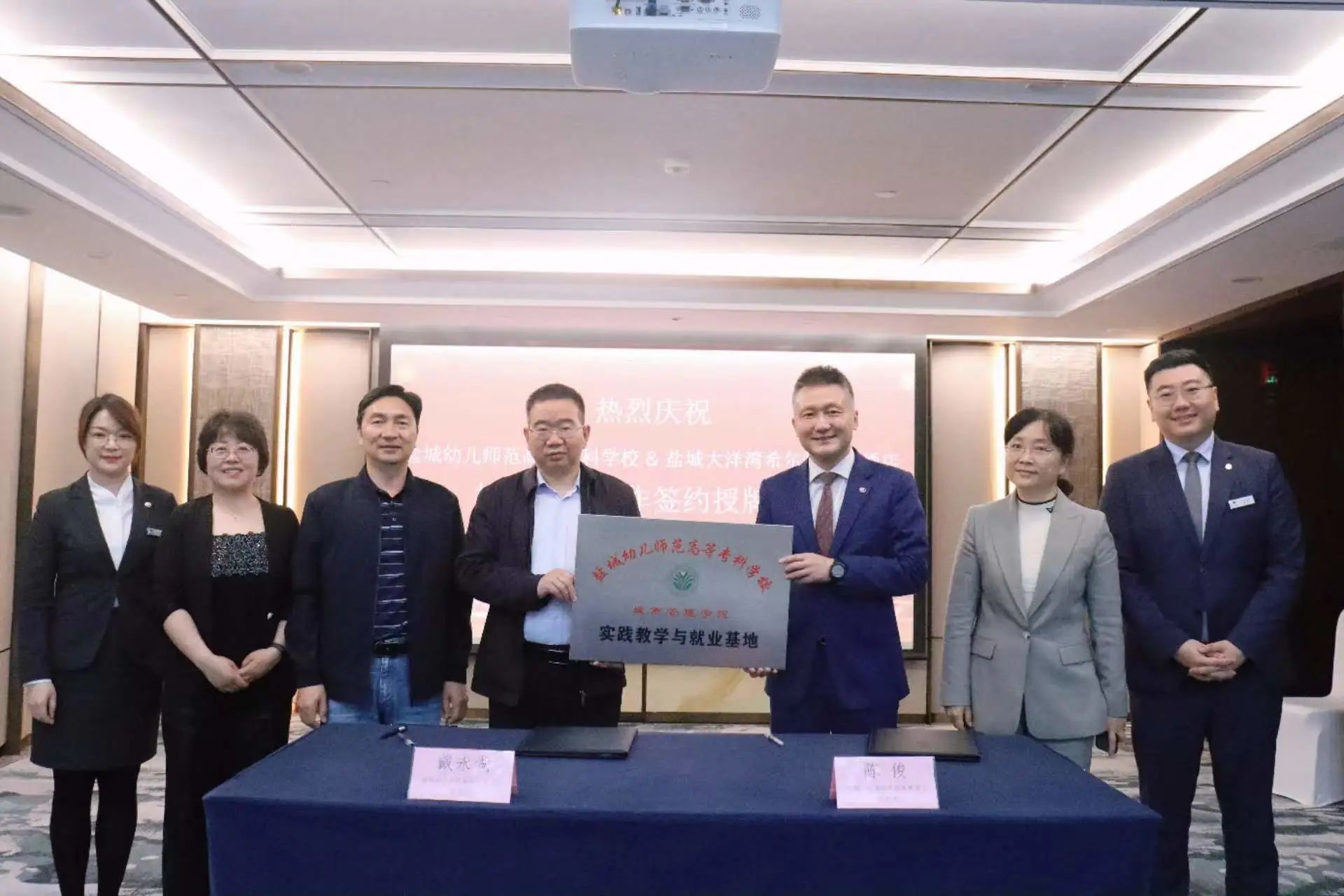 5月30日上午,我校与盐城大洋湾希尔顿逸林酒店签订校企战略合作协议。签约和授牌仪式在逸林酒店会议室举行。我校副校长戴永湖、城市管理学院院长秦立山、党总支书记尚海燕、副院长杨谢、盐城大洋湾希尔顿逸林酒店总经理陈俊、人力资源总监杨洋、人力资源部副经理肖呀出席仪式。